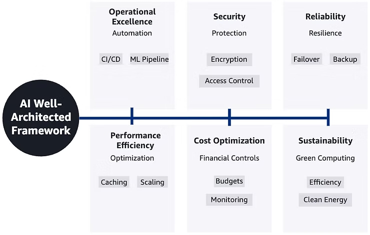 AWS Well-Architected Framework gồm 6 trụ cột nền tảng, cung cấp hướng dẫn đầy đủ để xây dựng hạ tầng cho ứng dụng theo hướng an toàn, hiệu năng cao, bền bỉ và tối ưu vận hành.