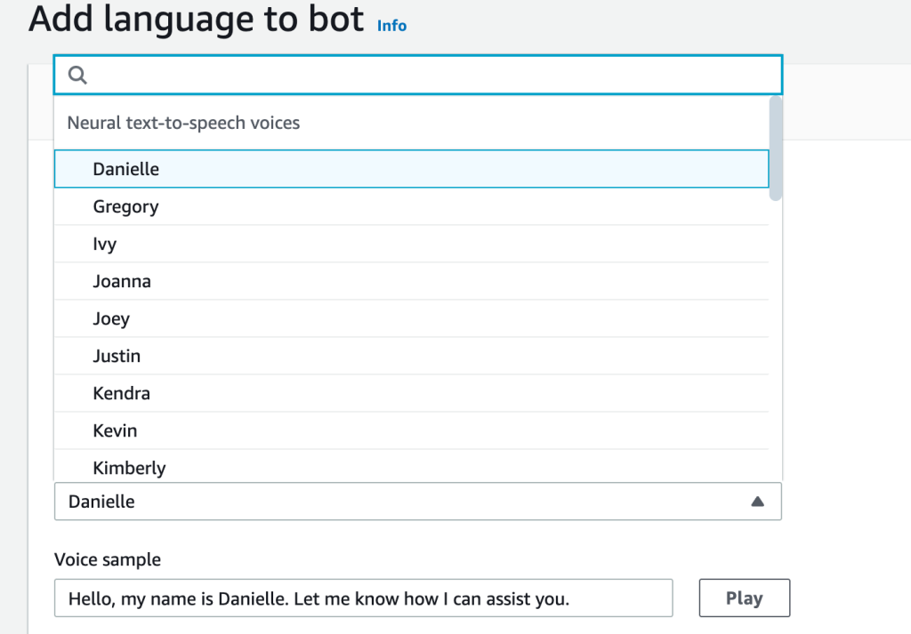 - Chọn giọng đọc cho bot (text-to-speech). Amazon Lex cho phép nghe thử từng giọng, rất tiện để chọn giọng phù hợp với trải nghiệm người dùng.