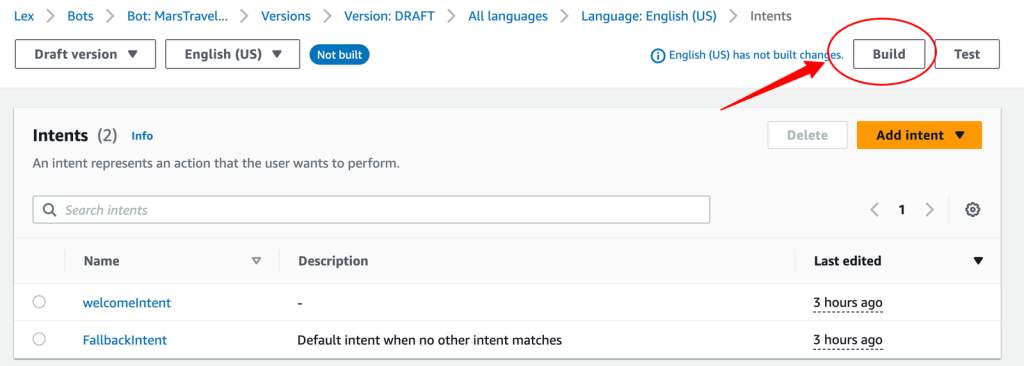 Sau khi đã cấu hình intent, bạn cần build bot để áp dụng toàn bộ thiết lập.