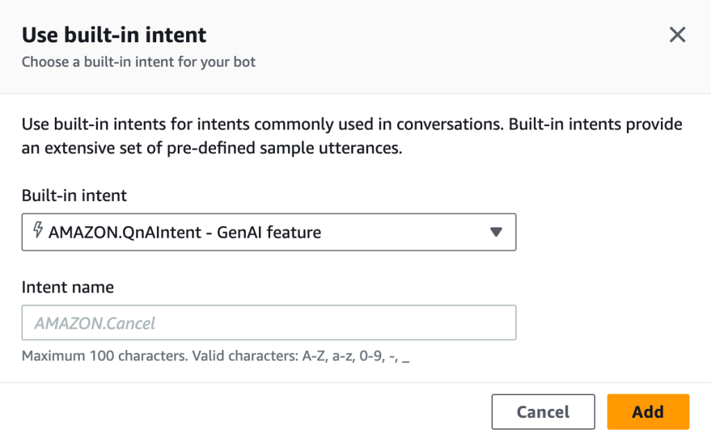 Bước 6: Thêm Amazon QnAIntent để bot trả lời từ knowledge base